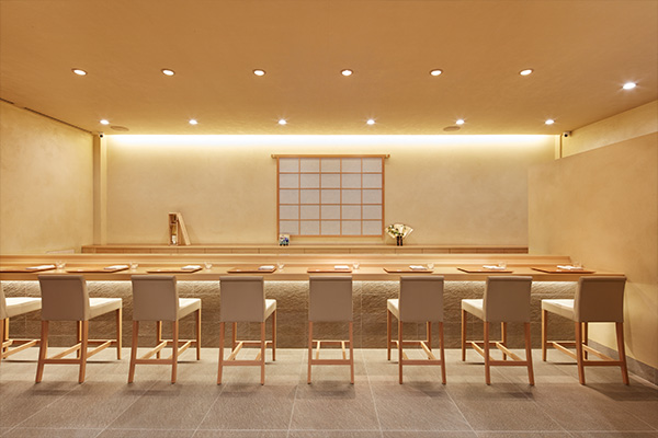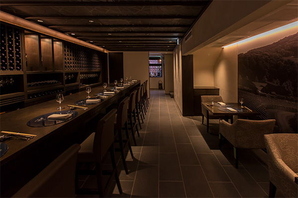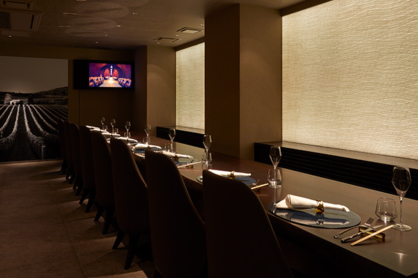 銀座4丁目の交差点からもすぐのロケーションにありながら、都会の喧騒を微塵にも感じさせない隠れ家的な銀座店。1階にあるのは、アフリカ産ウエンジの木を使った1枚板に、わずか8席だけを配したカウンター。壁一面には、京都の和紙デザイナーが手掛けた創作和紙があしらわれ、淡い光に照らされて、心安らぐ雰囲気を醸し出しています。地下1階には、ワイナリーのテイスティングルームを彷彿させるかのように、数多のワインボトルが並ぶ大きな棚を配したカウンターがあり、その奥には個室も用意されています。