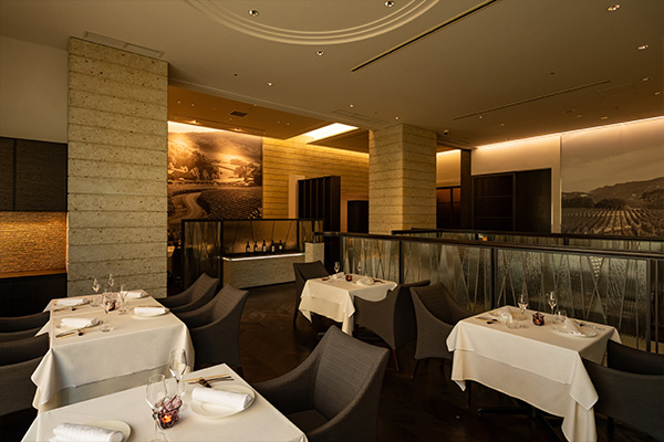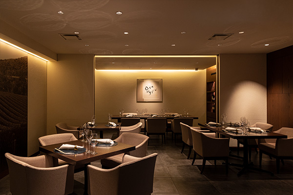 ケンゾー エステイトの関西の拠点と言える大阪店は、大阪駅から徒歩で3分ほどの裏通りに面した路面店。通りから見えるのは、ワイナリーのゲートをモチーフにした石の壁。夜にはライトアップされ、その店構えを美しく彩っていきます。さらにその奥には、同じくワイナリーのテイスティングルームを模したダイナミックなカウンターが、壁一面を覆い、その裏には、エレガントな雰囲気に包まれたダイニングが広がっています。ここでいただけるのは、素材の持ち味を生かして創作されるモダンフレンチ。その洗練された味わいが、ワインとのマリアージュに新たな可能性をもたらすことでしょう。