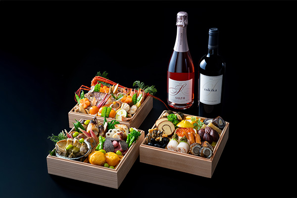 ケンゾー エステイトのワインに合わせて作られた特製おせち。今年はミシュランシェフ宮石 謙氏総料理長監修の「和乃三段重おせち-縁- enishi」に、ワインはナパのワイナリー限定「心香 tokika」と「寿々 suzu」のセット。ワイナリー開業15周年「感謝の心を込めて-宝寿- houshu」に、ワインはお好きな銘柄(フルボトル換算2本)のセットをご用意しています。