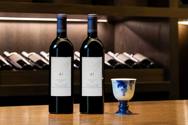有田焼の名窯「深川製磁」様にて、トップ・キュベ「藍」のために特別に製作いただいた、ケンゾー エステイト オリジナルの酒器。「藍 2021」のご予約期間、この貴重な酒器とフルボトル2本、またはフルボトル1本とハーフボトル2本のセットにて、限定150セット販売いたします。